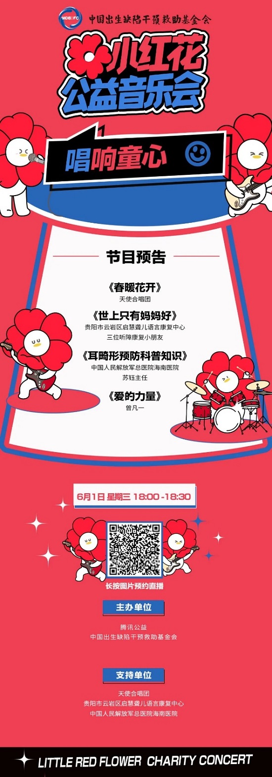 同日,特邀请天使合唱团、贵州市云岩区启慧聋儿语言康复中心的小朋友及曾凡一女士,共同参与“六一小红花音乐会”,为小朋友们带来精彩节目,希望大家能更多关注患有出生缺陷疾病的小朋友及其家庭,以及默默奉献的工作人员和志愿者们,让我们一起献出一份爱心,助力孩子们健康成长。