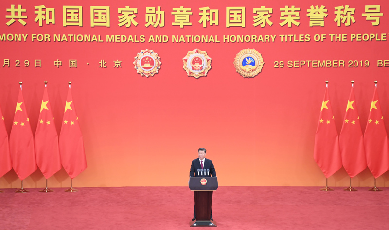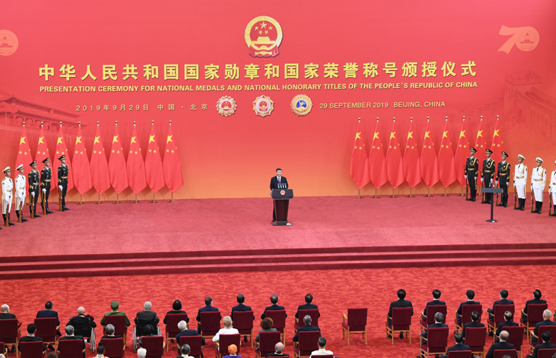 9月29日,中华人民共和国国家勋章和国家荣誉称号颁授仪式在北京人民大会堂金色大厅隆重举行。中共中央总书记、国家主席、中央军委主席习近平向国家勋章和国家荣誉称号获得者颁授勋章奖章并发表重要讲话。