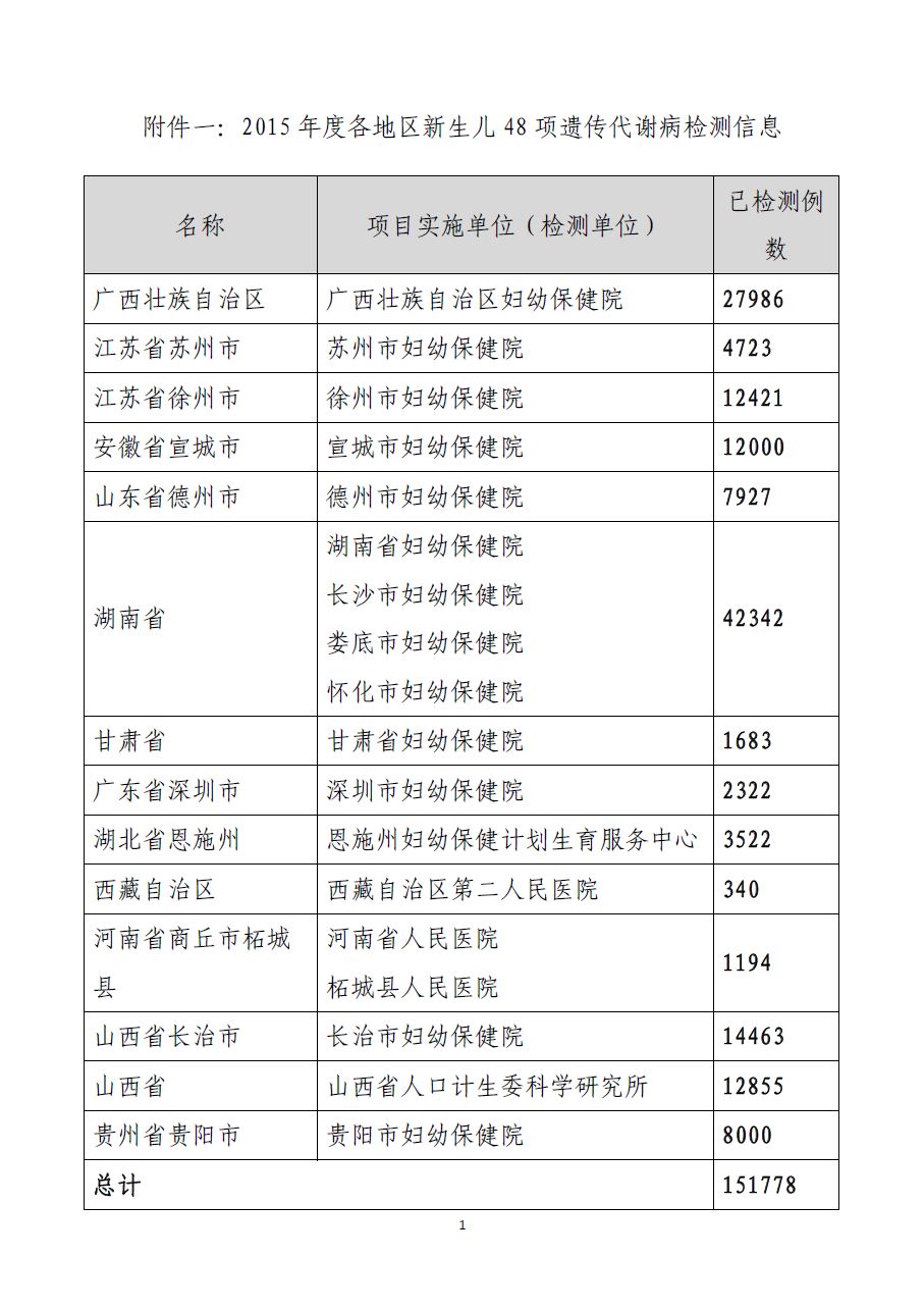 详情见《附件一:2015年度各地区新生儿48项遗传代谢病检测信息》