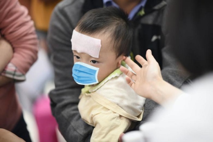 图为患儿接受耳部检查