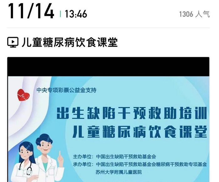 中国出生缺陷干预救助基金会昨天在苏州大学附属儿童医院举办出生缺陷干预救助培训班—儿童糖尿病饮食课堂,并同步进行线上直播。