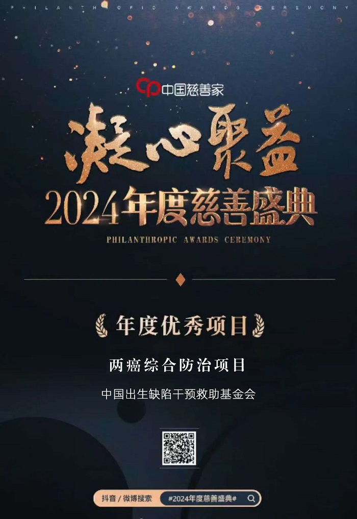 2025年1月8日,由《中国慈善家》杂志主办的“凝心聚益”2024年度慈善盛典在北京举行,“两癌”综合防治项目荣获2024年度优秀项目奖。