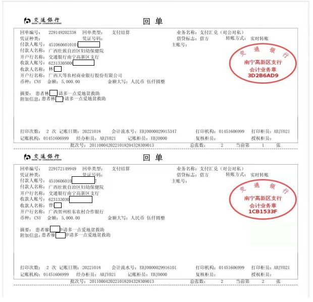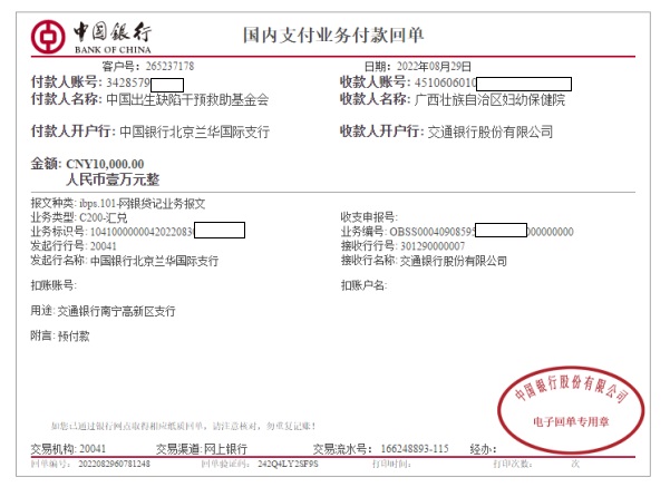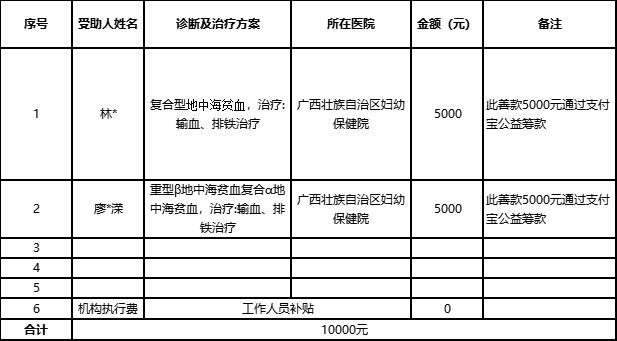 基金会已通过广西壮族自治区妇幼保健院将救助金拨付至小峰(化名)监护人5000元救助金及小静(化名)监护人5000元救助金。