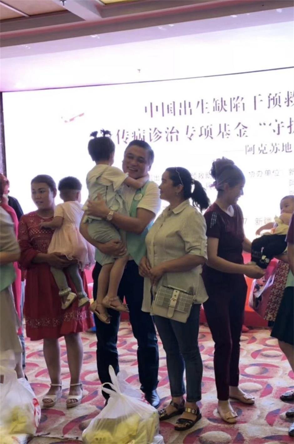 基金会遗传病诊治基金副主任汪屹巍抱着阿克苏宝宝爱不释手