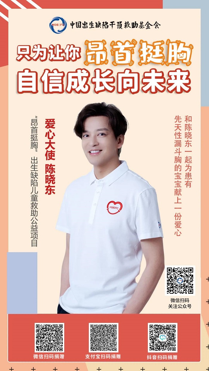 明天是六一儿童节,健康是给孩子最好的礼物。中国出生缺陷干预救助基金会在儿童节到来之际,邀请陈晓东、卞子严两位明星,为“先天性漏斗胸”项目发声,呼吁更多人关注出生缺陷患儿群体。本项目在字节跳动公益平台、微公益平台、腾讯公益平台、支付宝公益平台同时上线,并在北京西单、阜成门、金地广场、合生汇等地进行线下公益广告投放。