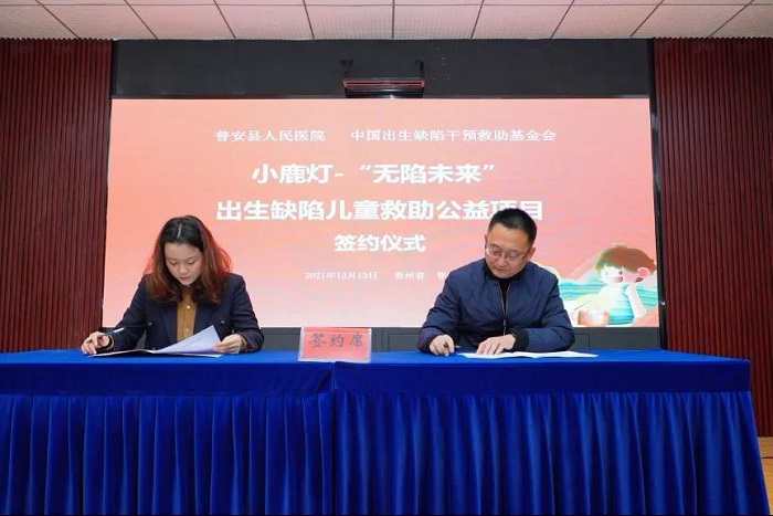 2021年12 月 13 日,小鹿灯-“无陷未来”出生缺陷儿童救助公益项目正式在贵州省黔西南布依族苗族自治州普安县正式启动。项目由中国出生缺陷干预救助基金会、阿里健康公益联合发起,阿里公益提供支持,计划在我国经济欠发达的重点县域优先开展出生缺陷救助,为这些县域内需要帮助的患儿提供资金救助与优质医疗服务。