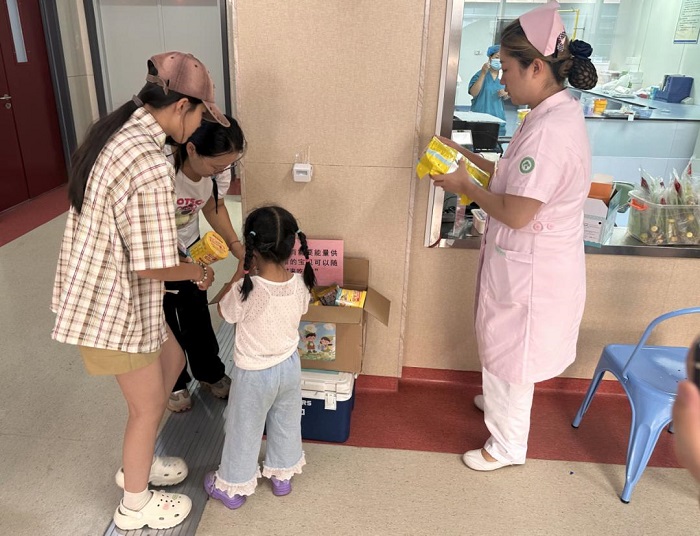 暖心能量补给环节:为帮助孩子们顺利完成空腹采血,遗传优生科的志愿者们特别设置了温馨的免费餐食补给服务,累计拆开约10箱各类小零食。每一位小朋友完成采血后,都能及时领取食物、补充能量,有效防止低血糖和身体不适的发生。有趣的是,许多孩子为了能早点吃到零食,采血时都表现得特别勇敢。这一贴心安排不仅缓解了孩子们的紧张情绪,也赢得了家长们的一致称赞和真诚感谢。