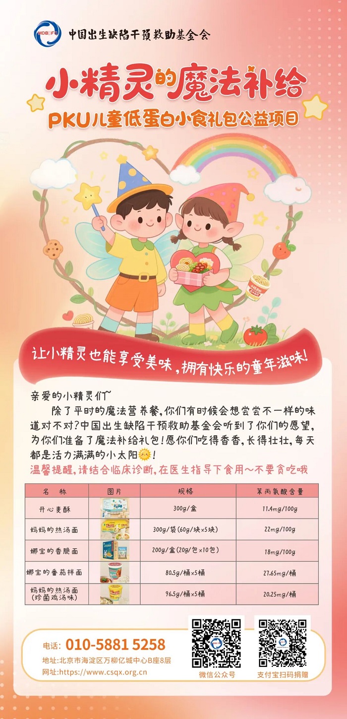 苯丙酮尿症(PKU)给这些家庭带来了沉重的挑战,患儿们需终生依赖特制低蛋白食品维持健康。为了让孩子们在节日里也能享受快乐,基金会联合爱心企业精心准备了“小精灵的魔法补给” 礼包。礼包中的无苯丙氨酸配方食品不仅满足了孩子们的饮食需求,更传递着节日的祝福。